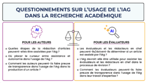 Les enjeux ne portent plus sur l’intégration de ces outils dans la recherche académique mais plutôt sur la façon d’y avoir recours de manière responsable et éthique. La nécessité de définir une intégrité académique dans les usages de ces outils est aujourd’hui indispensable (Gatrell et al., 2024). Jones (2025) considère que l’autonomie