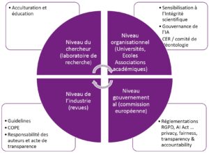 - L’équipe de recherche : la régulation repose sur l’éthique du chercheur et sur sa connaissance des risques engendrés par l’IAg. L’auteur préconise davantage de sensibilisation des chercheurs aux enjeux éthiques.