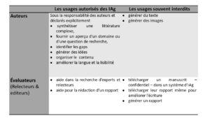 Les recommandations quant à l’utilisation de l’IAg varient selon les éditeurs des revues. Par exemple, Elsevier (https://www-elsevier-com/about/policies-and-standards/generative-ai-policies-for-journals) et Sage (https://www.sagepub.com/journals/publication-ethics-policies/artificial-intelligence-policy) décrivent, de manière explicite ce qui est admis pour les auteurs, reviewers et éditeurs contrairement à Taylor & Francis. Les revues françaises en gestion, en nombre croissant, demandent aux auteurs d’être transparents dans leur usage de l’IAg et mentionnent explicitement l’interdiction d’une délégation de l’évaluation à une IAg. Le tableau 2 récapitule les recommandations des éditeurs.