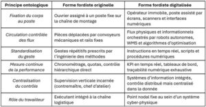 À ce titre, positionner le fordisme comme ontologie opérationnelle y compris dans des chaînes logistiques digitalisées, permet de mieux interpréter (et relativiser) les discours contemporains sur la « rupture » technologique. Les innovations, à la fois au niveau de la robotisation, de l’automatisation, et de l’usage intensif de l’IA, sont rarement introduites pour transformer fondamentalement la logique opératoire. Elles visent avant tout à amplifier la performance tout en maintenant le poste fixe comme centre de contrôle. Les opérateurs deviennent des points de données vivants à travers des badges, scanners, capteurs portables et interactions pilotées par les tableaux de bord (pour une revue de littérature, voir Zhen et Li [2022]). Les flux physiques et numériques sont orchestrés par des algorithmes, les cadences sont ajustées automatiquement, et les écarts sont signalés en temps réel. L’efficacité s’accroît, mais la structure sous-jacente reste identique à celle pensée par Henry Ford il y a plus d’un siècle de cela : fixation du corps, circulation des flux et capture complète du temps productif (voir le Tableau 1). Un tel héritage historique, en grande partie invisible, démontre que le fordisme n’a pas disparu, il est simplement inscrit dans le code et la donnée. Pour s’en convaincre, si besoin était, un retour vers les entrepôts des grands distributeurs de l’univers online et offline constitue un système de preuves suffisamment robuste.