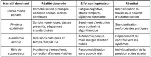 L’illusion de la rupture est fortement ancrée dans la littérature, en se nourrissant d’un langage optimiste et d’une représentation orientée performance. Les conférences internes, webinars et communiqués mettent en avant des KPI positifs pour l’expérience client, avec une précision accrue dans la préparation des commandes (réduction des erreurs au niveau des produits livrés) et un temps moyen de traitement raccourci (réduction des délais de livraison). Les outils de visualisation des données créent en outre l’illusion que le travail des préparateurs de commandes est transformé en profondeur et que l’IA leur apporte une véritable autonomie décisionnelle. Pourtant, sur le terrain, ces mêmes préparateurs de commandes expérimentent clairement une nouvelle forme de fordisme algorithmique : immobilisation des corps, circulation orchestrée des flux, cadence dictée par des calculs et non par le rythme naturel des humains (Kellogg et al., 2020). Les innovations technologiques ne suppriment donc pas une ontologie opérationnelle née au début du XXe siècle, elles l’intègrent et la prolongent. Un tel constat nous semble crucial, autant pour les managers que pour les syndicats professionnels : la promesse de rupture est partielle, et l’IA, loin de libérer, réinvente le travail selon les principes du fordisme, en le rendant plus efficace, plus contrôlable et plus dépendant des systèmes numériques. Le Tableau 2 met en évidence le décalage structurel entre les promesses de rupture portées par les discours managériaux sur l’IA et l’automatisation, et la réalité opératoire vécue par les opérateurs, marquée par un renforcement du contrôle algorithmique.