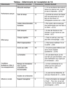 Les conditions d’utilisation de l’IA jouent un rôle plus structurant qu’attendu. L’accès aux outils (19 occurrences), la formation (14 occurrences) et le manque de formalisme dans l’exploitation entière des fonctionnalités IA (6 occurrences) apparaissent déterminants pour faciliter l’intégration durable. Le rôle déterminant de cette dimension s’appuie de manière complémentaire par le soutien de l’organisation. Cet appui est primordial dans l’acceptation et s’exprime par l’appui de ligne hiérarchique (6 occurrences) ou du personnel support IA (6 occurrences). Ainsi, en cohérence avec les prolongements d’UTAUT intégrant les variables contextuelles, l’acceptation s’inscrit dans un environnement organisationnel qui facilite et pérennise l’usage. Le tableau synthétise l’ensemble des résultats.