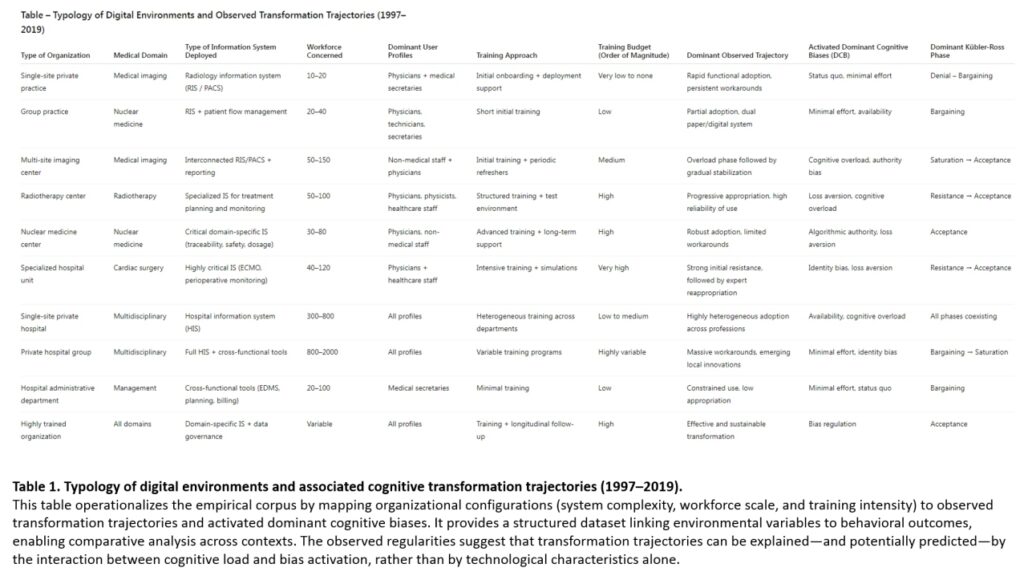 Cet article propose une relecture neurocognitive de la transformation numérique à partir d’une analyse longitudinale de plus de 400 organisations médicales observées sur vingt-deux ans. Contrairement aux approches technocentrées, les résultats montrent que les trajectoires d’appropriation des systèmes d’information sont principalement déterminées par la configuration dynamique de biais cognitifs activés face à une perte symbolique induite par le changement.